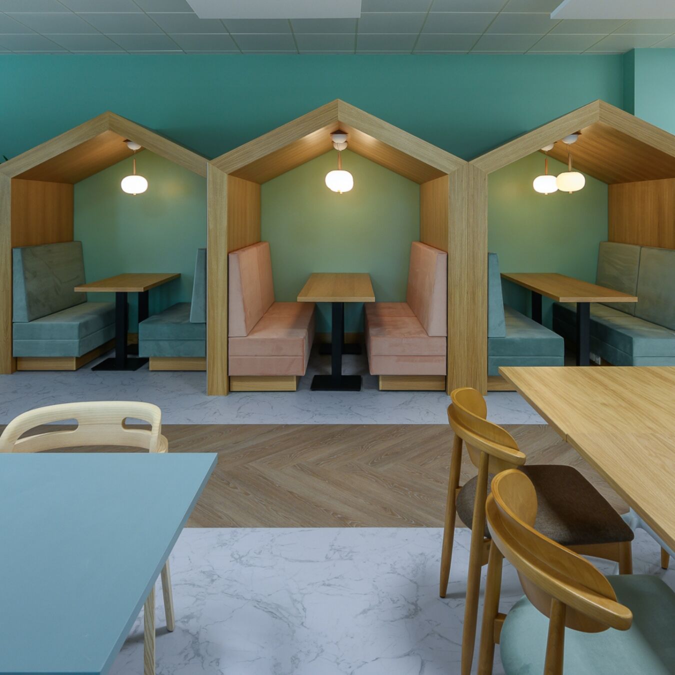 Modern cafe with light wooden tables and pastel seating inside cozy, house-shaped booths. Soft lighting creates a calm, inviting atmosphere