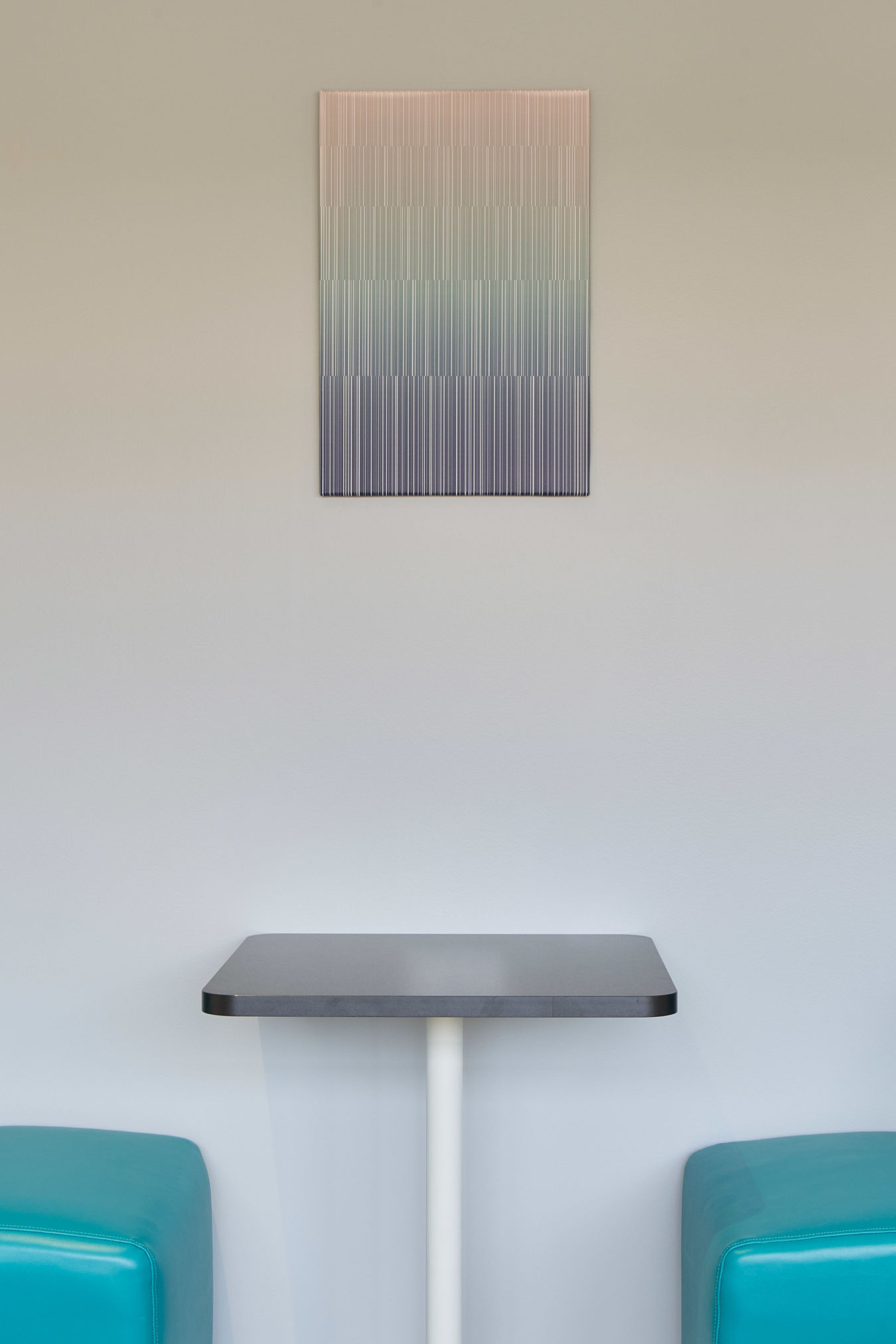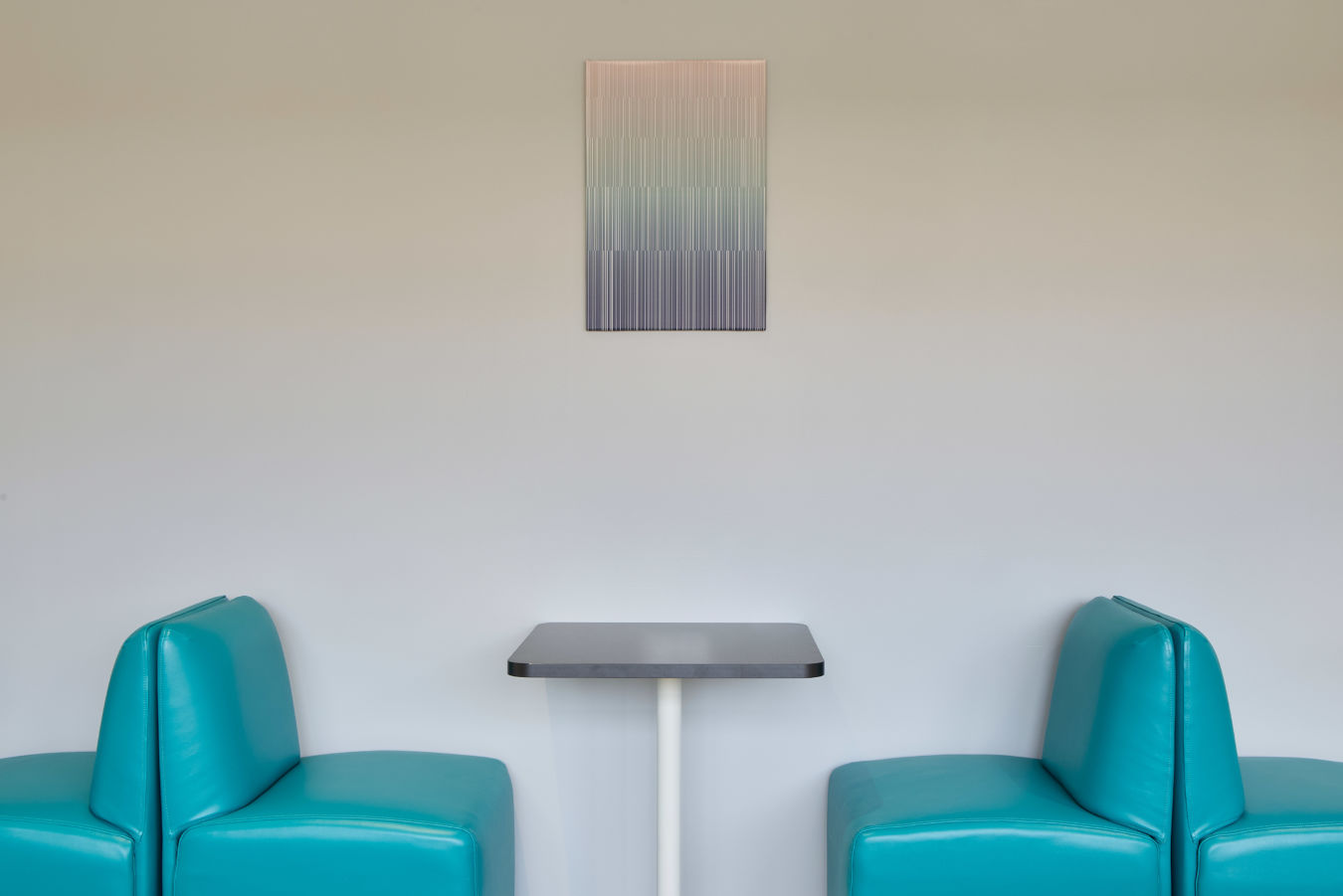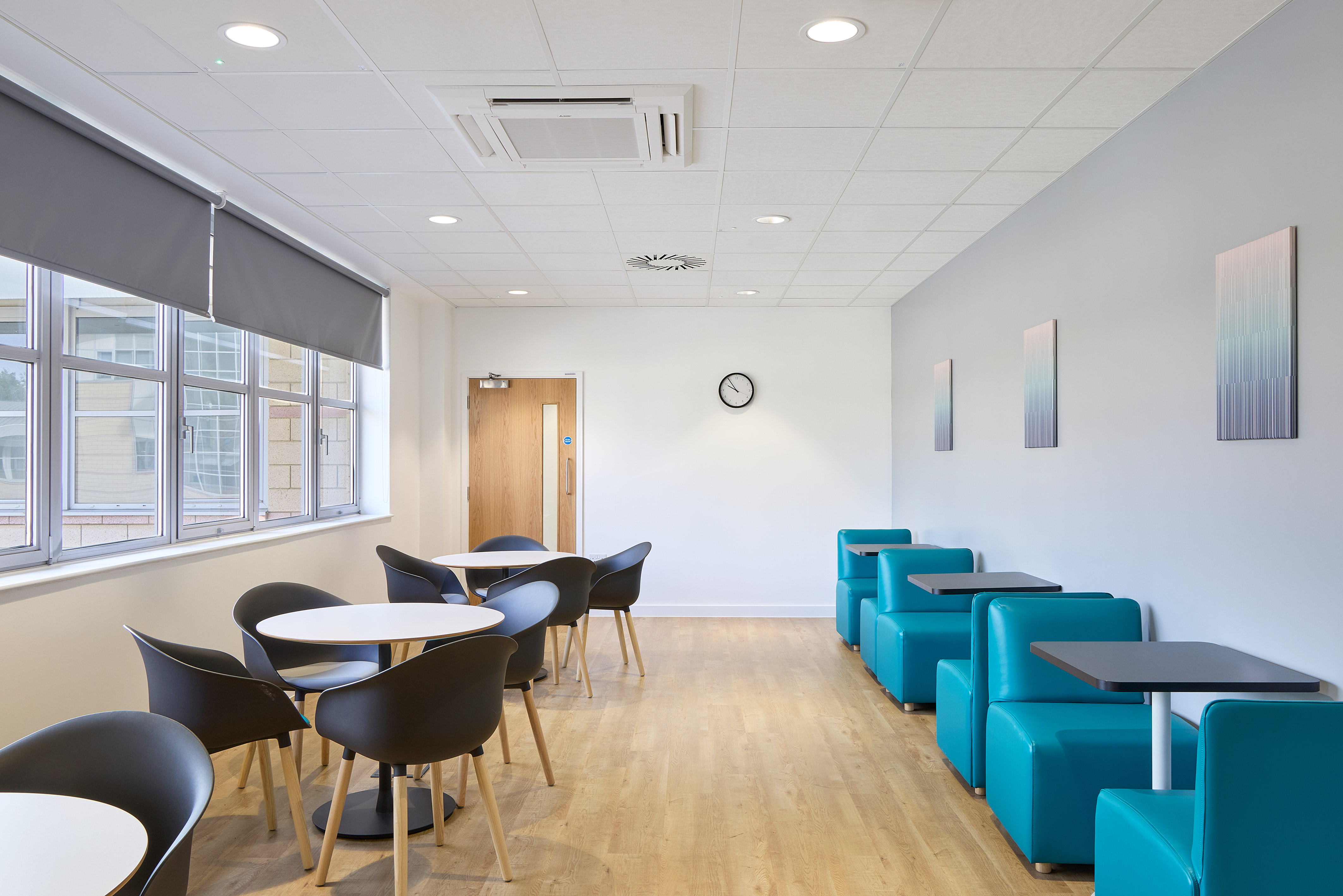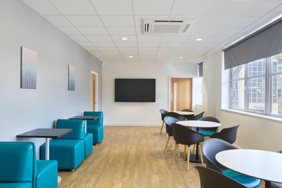 The workspace design was simple in its approach, with a clinical, clean style to suit the workings of the NHS. Their reception offers a light introduction to the centre, with a luminated sign on beautiful NHS inspired wallpaper. A nod to their secondary teal colour can be seen in some of the more people-focused spaces, including the two offices and pantry / kitchenette. Their ‘Lounge’ breakout area offers a further splash of teal in terms of the benching and chairs chosen. This is a fresh modern space in which those in training can break from focused work to meet for much-needed breaks and lunch in a comfortable and bright environment.