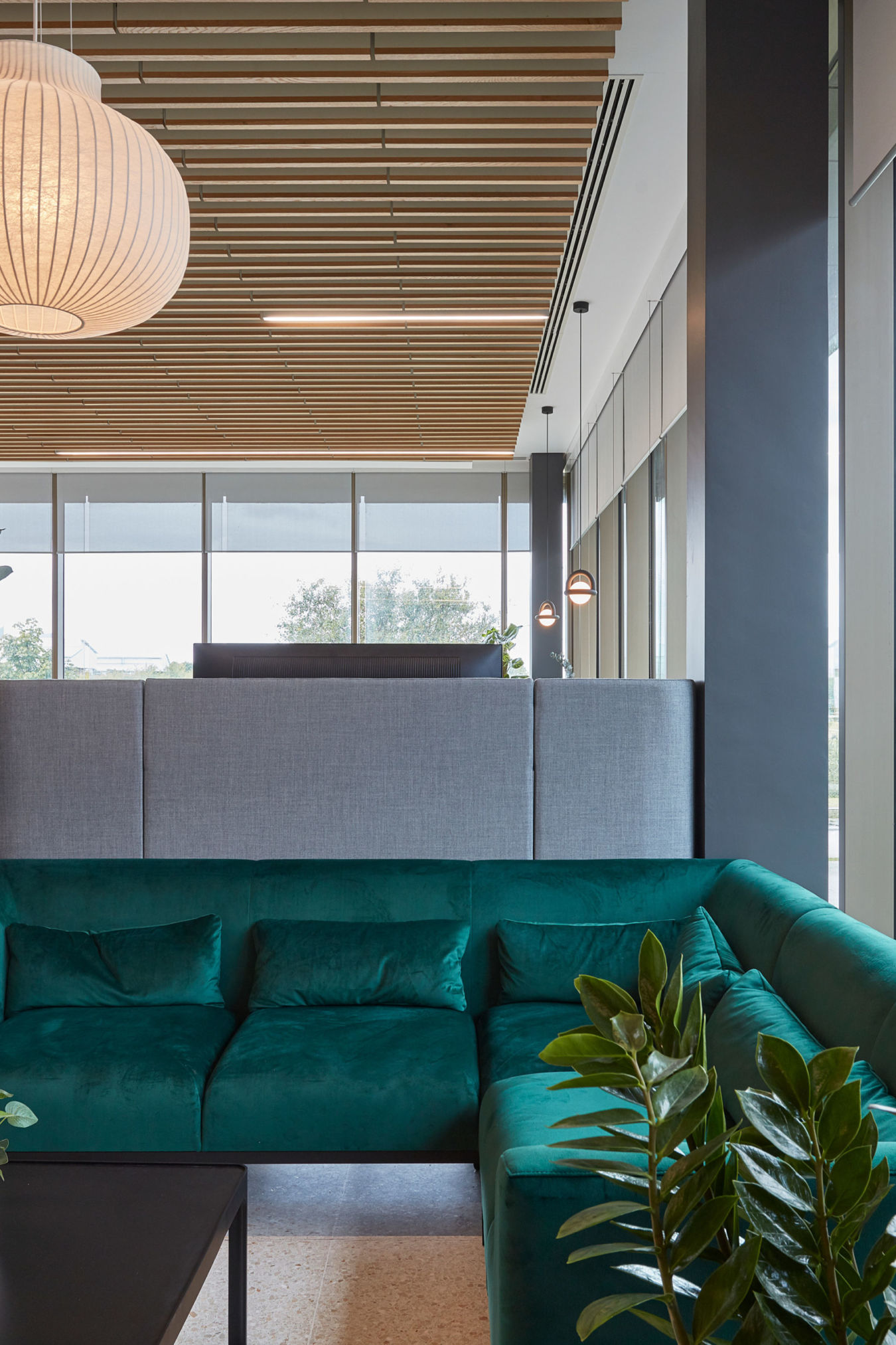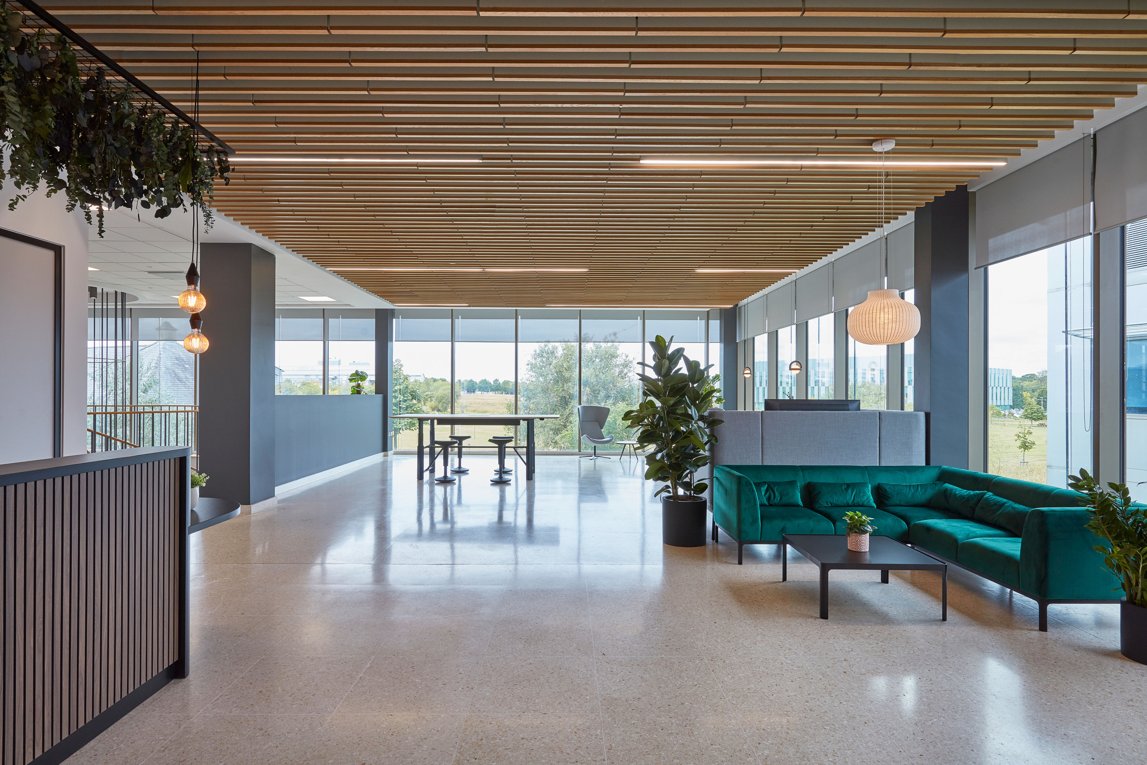 Sphere Bio places high importance on employee wellbeing so the communal spaces were a key part of the brief, to foster collaboration and increase productivity. From the welcoming front desk and relaxing reception space flooded with natural light, to the feature staircase which leads down to the main communal spaces and the variety of casual meeting spaces, the scheme was meticulously planned to meet the diverse needs of the team. But in our humble opinion it is the kitchen and town hall area, opening out onto the green spaces, and featuring clever planting to continue the natural theme, which truly sets this design apart.
